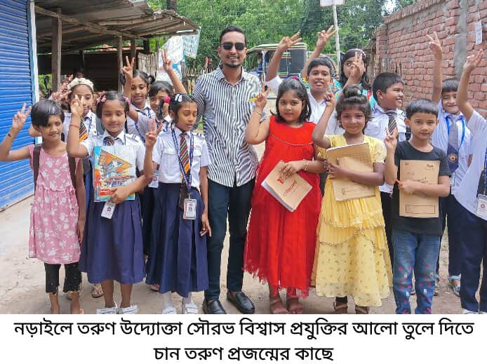 নড়াইল শহর সমাজসেবা কার্যালয়ের অধীন দক্ষতা উন্নয়ন প্রশিক্ষণ কেন্দ্রে আইটি ইন্সট্রাক্টর হিসেবে কর্মরত সৌরভ পেশাগত দায়িত্বের বাইরে নিজ উদ্যোগে কাজ করছেন শিশু-কিশোরদের প্রযুক্তি শিক্ষায় উদ্বুদ্ধ করতে। সম্প্রতি তিনি স্থানীয় একটি স্কুলে যান। সেখানে ছোট্ট শিক্ষার্থীদের সঙ্গে সময় কাটান এবং প্রযুক্তি জগৎ সম্পর্কে ধারণা দেন।