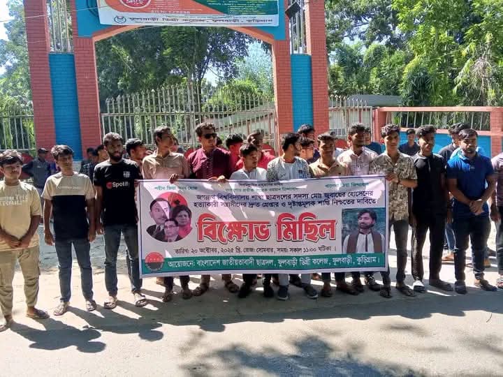 জগন্নাথ বিশ্ববিদ্যালয় (জবি) ছাত্রদল নেতা জুবায়ের হোসেন জোবায়েদ হত্যার সুষ্ঠু তদন্ত ও খুনিদের প্রকাশ্য বিচারের দাবীতে কুড়িগ্রামের ফুলবাড়ীতে ফুলবাড়ী ডিগ্ৰী কলেজ ছাত্রদলের বিক্ষোভ মিছিল অনুষ্ঠিত হয়েছে।