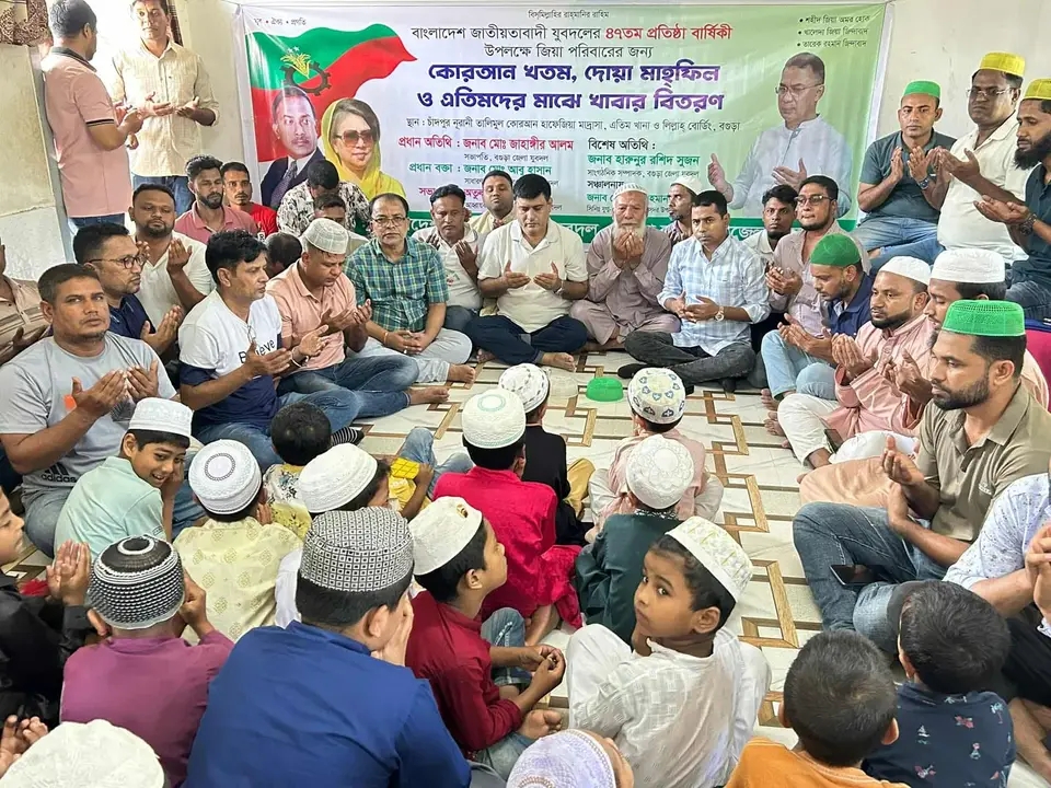 বাংলাদেশ জাতীয়তাবাদী যুবদলের ৪৭তম প্রতিষ্ঠাবার্ষিকী উপলক্ষে বগুড়ায় জিয়া পরিবারের জন্য কোরআন খতম, দোয়া মাহফিল এবং এতিমদের মাঝে খাবার বিতরণ অনুষ্ঠিত হয়েছে।