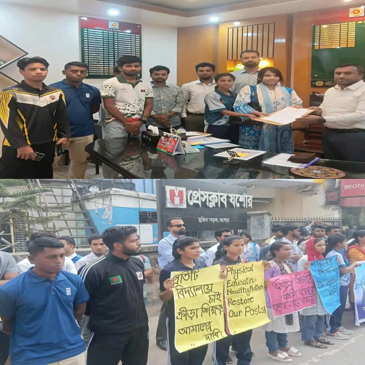 প্রাথমিক শিক্ষায় সংগীত ও শারীরিক শিক্ষার সহকারী শিক্ষক পদ বাতিলের সিদ্ধান্তের প্রতিবাদে যশোরে ক্রীড়াবিদদের প্রতিবাদ সমাবেশ অনুষ্ঠিত হয়েছে।
