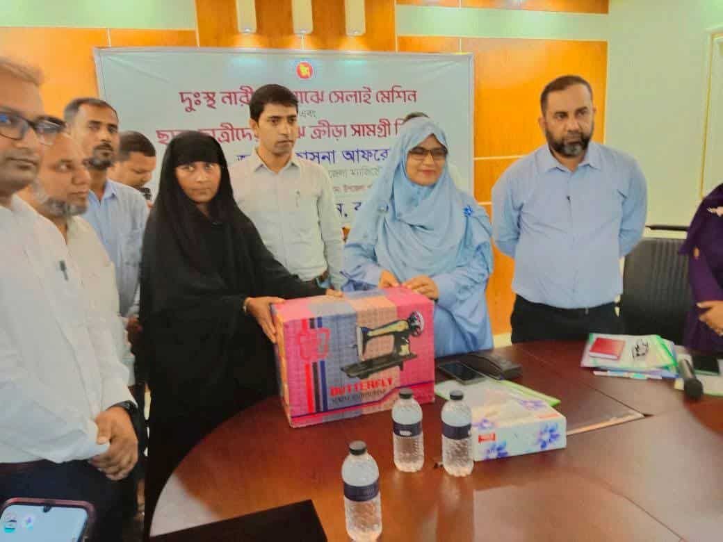 অনুষ্ঠান শেষে প্রধান অতিথি নিজ হাতে নির্বাচিত দুস্থ নারীদের মাঝে সেলাই মেশিন এবং শিক্ষার্থীদের হাতে ক্রীড়া সামগ্রী তুলে দেন।