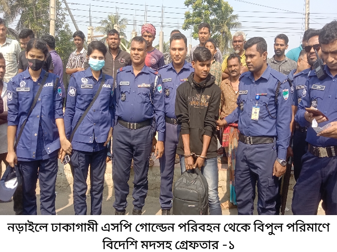 নড়াইলে ঢাকাগামী এসপি গোল্ডেন পরিবহন থেকে বিপুল পরিমাণে বিদেশি মদসহ গ্রেফতার ১